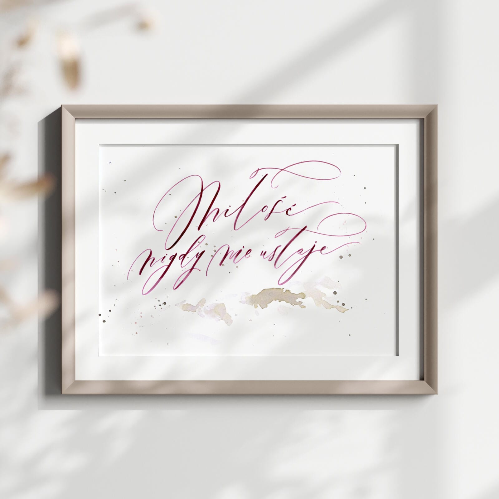 Ręcznie kaligrafowany plakat z cytatem „Miłość nigdy nie ustaje” to elegancki i symboliczny prezent ślubny, który zostaje na lata. Każdy egzemplarz tworzony jest odręcznie, z użyciem lekko połyskującego tuszu – dzięki temu każdy jest wyjątkowy. Doskonały prezent na ślub lub rocznicę.